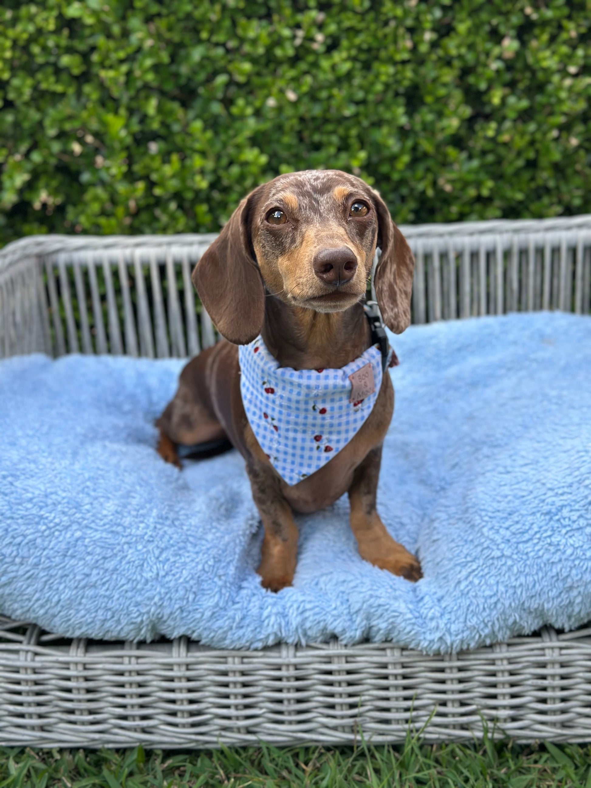 Our Cherries & Cream Check Bandana is the prefect fruity favourite. The gingham background, strawberries & cherries pattern and floral embroidery make the pawfect combination! Add a touch of personality to your pup’s style with our handcrafted Bandanas! Designed for your pet's collar to slide through them, no tying or fussing required. These bandanas stay secure and comfy all day long.