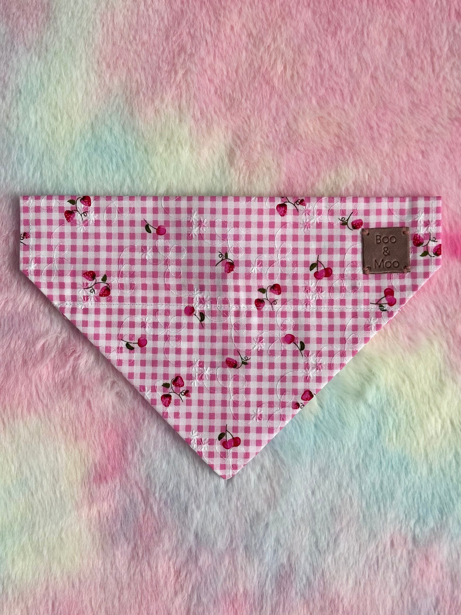 Our Strawberry Breeze Plaid Bandana is the prefect fruity favourite. The gingham background, strawberries & cherries pattern and floral embroidery make the pawfect combination! Add a touch of personality to your pup’s style with our handcrafted Bandanas! Designed for your pet's collar to slide through them, no tying or fussing required. These bandanas stay secure and comfy all day long.