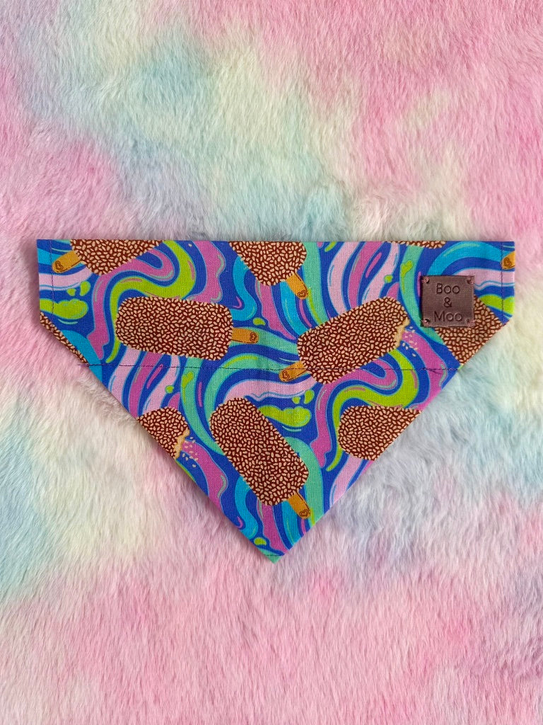 Our You're So Golden Bandana is a customer favourite and a great take on an Aussie favourite ice cream. Add a touch of personality to your pup’s style with our handcrafted Bandanas! Designed for your pet's collar to slide through them, no tying or fussing required. These bandanas stay secure and comfy all day long.